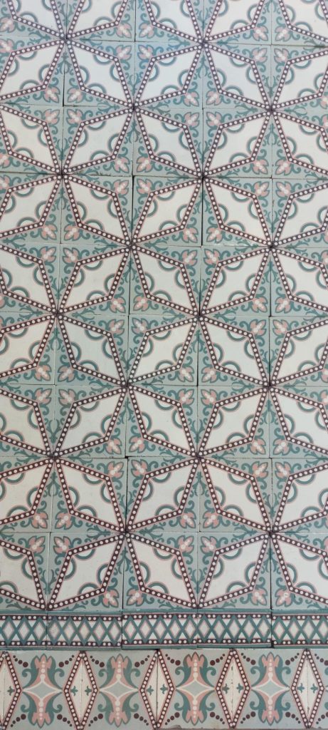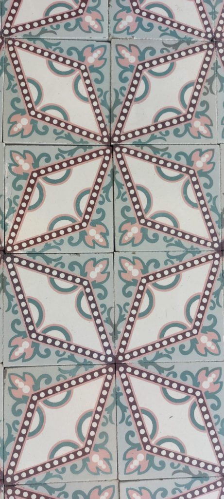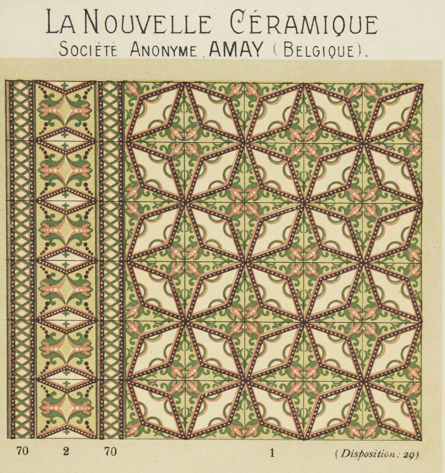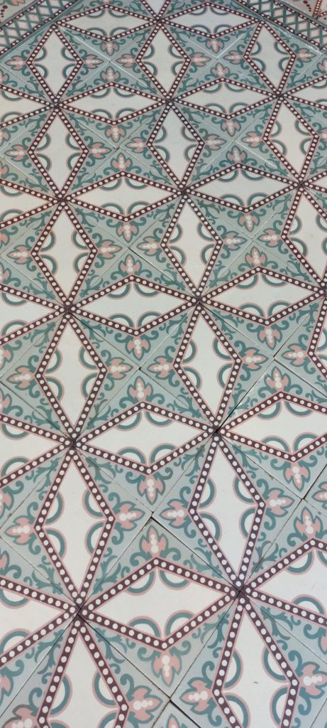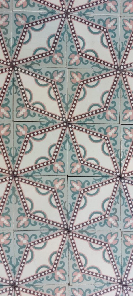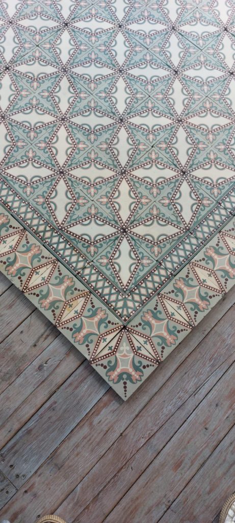 These beautiful Art Nouveau tiles feature a refined dotted star motif in soft shades of pink and green. They originate from an elegant maison de maître near Ath and are accompanied by a matching double border that frames the whole beautifully.